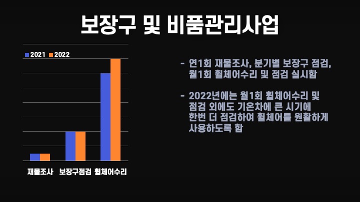 그래서 내년에는 교육을 통해서 직원을 잘 교육시켜서, 보행훈련을 다시한번 잘해보겠다.라고 결론짓고 끝냅니다. PPT 만드는 것부터 발표까지 부담이 될 거 같은데, 어차피 다들 버벅거릴 테니 마음 편하게 하시면 좋겠습니다. PPT에는 많은 내용을 담기보다는 간단한 내용만 깔끔하게 담으시는 편이 좋습니다. 발표전에 꼭 한번 발표하는 곳에서 켜보시기를 바랍니다. 저는 원래 바탕을 흰색으로 했다가 하나도 보이지 않아서 전부 까만색으로 만들었습니다. 그전에 흰색에 회색 그러데이션으로 컴퓨터 화면에서 보기에는 꽤 예뻤는데... 혹시 파일이 필요하실 분들을 위해서 첨부해두겠습니다. 다들 즐거운 연말 되셨으면 좋겠습니다.