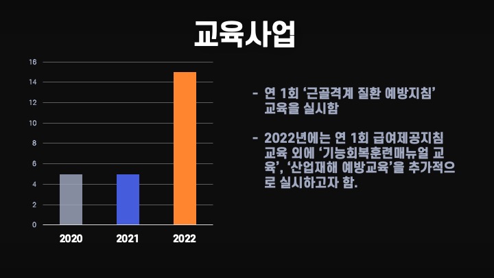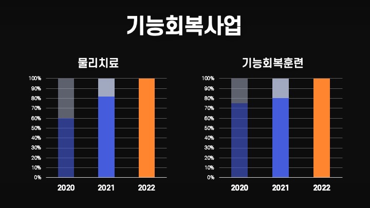 다음은 사업내용입니다. 첫번째는 기능 회복사업이라고 거창하게 이름을 붙였지만 자세히 읽어보면 물리치료를 실시했다는 것을 어렵게 적어놓은 것입니다. 물리치료 후 얼마나 좋아졌는지는 ADL 점수나 통증 강도 점수를 이용하여 나타냈습니다. 이사장님이 알아보기 쉽게 그래프로 죄다 적으라고 해서 그렇게 했는데, 너무 딱딱했다는 평가만 들었습니다. 시키는 대로 해도 욕을 꼭 먹습니다.