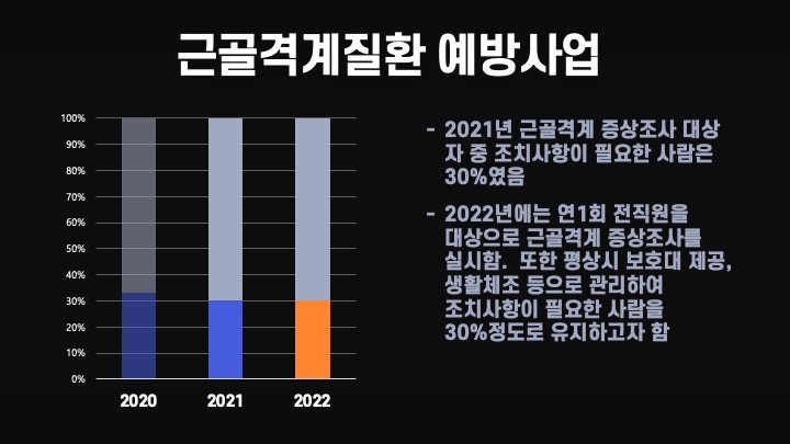 근골격계 질환 예방사업도 1년에 한 번 직원을 대상으로 설문지를 뿌리는 것을 그냥 또 어렵게 적어봤습니다. 이 요양원에서는 근골격계 증상 조사를 실시하고, 그에 대한 대책으로 매일 국민체조를 하고, 보호대를 제공했었습니다.