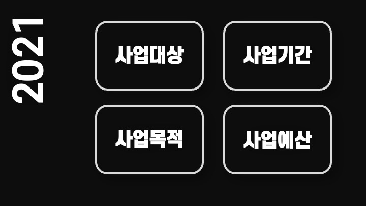 두 번째 장에는 목차 비슷하게 꼭 들어가야 하는 내용인 사업대상, 사업기간, 사업목적, 사업예산을 넣어줍니다. 세세한 내용을 적으면 어차피 읽을 것도 아니니 그냥 큼지막하게 써주고, 자세한 내용은 발표 시에 대충 읽고 넘어갑니다. 어차피 다른 과에 겹치는 내용이기 때문에 크게 중요하지 않다고 생각합니다.